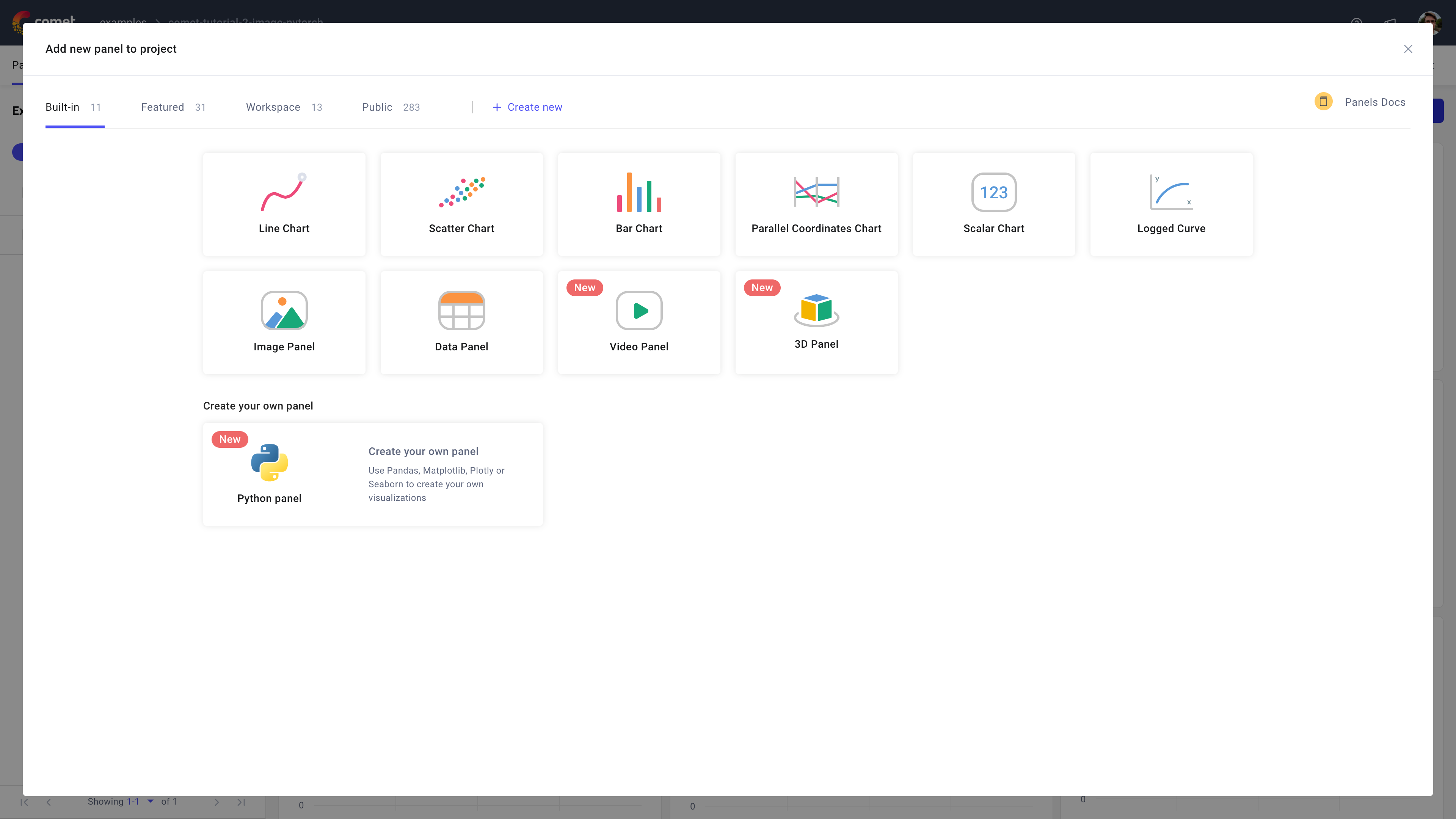 - Built-in: Comet's collection of essential panels: bar chart, data panel, image panel, line chart, logged curve, parallel coordinates chart, scalar chart, scatter chart, video panel, and 3D panel.
