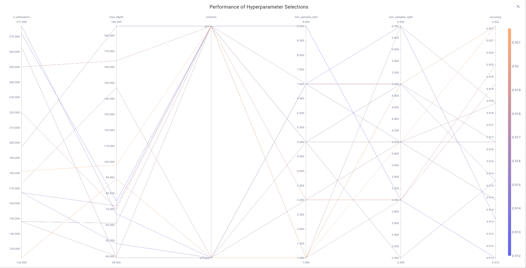 The Parallel Coordinates Chart allows you to visualize all the hyperparameter selections with resulting optimization performance.